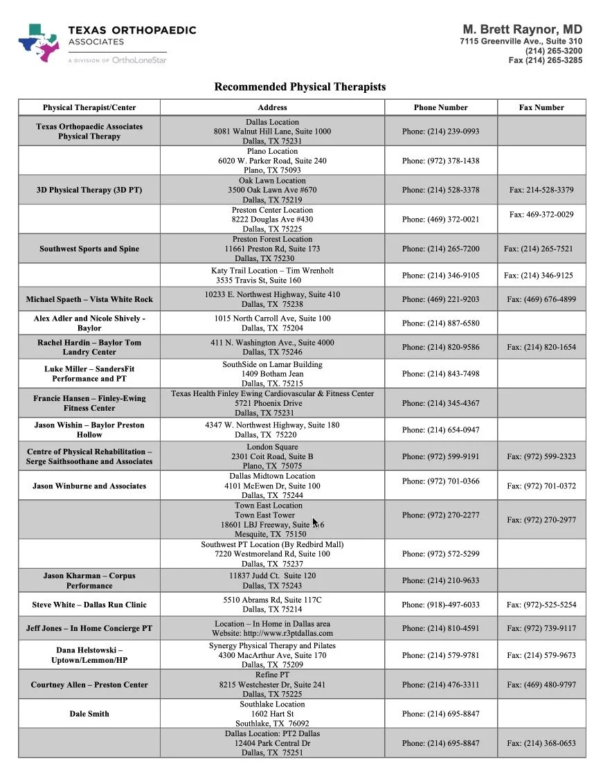 See below for some of our other recommended physical therapists in the DFW Metroplex.